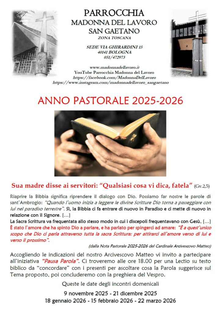 - Domenica 19 ottobre 2025 – 100° Giornata Missionaria Mondiale“Ti scongiuro davanti a Dio e a Cristo Gesù, che verrà a giudicare i vivi e i morti, per la sua manifestazione e il suo regno: annuncia la Parola, insisti al momento opportuno e non opportuno, ammonisci, rimprovera, esorta con ogni magnanimità e insegnamento” richiama con energia Paolo, nella seconda… Leggi tutto: Domenica 19 ottobre 2025 – 100° Giornata Missionaria Mondiale